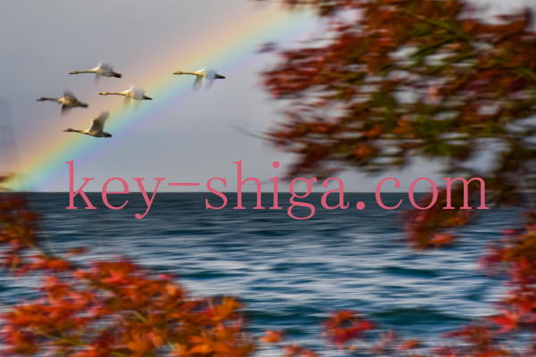 滋賀県長浜市、晩秋の湖北に飛来したコハクチョウを紅葉越しに流し撮り